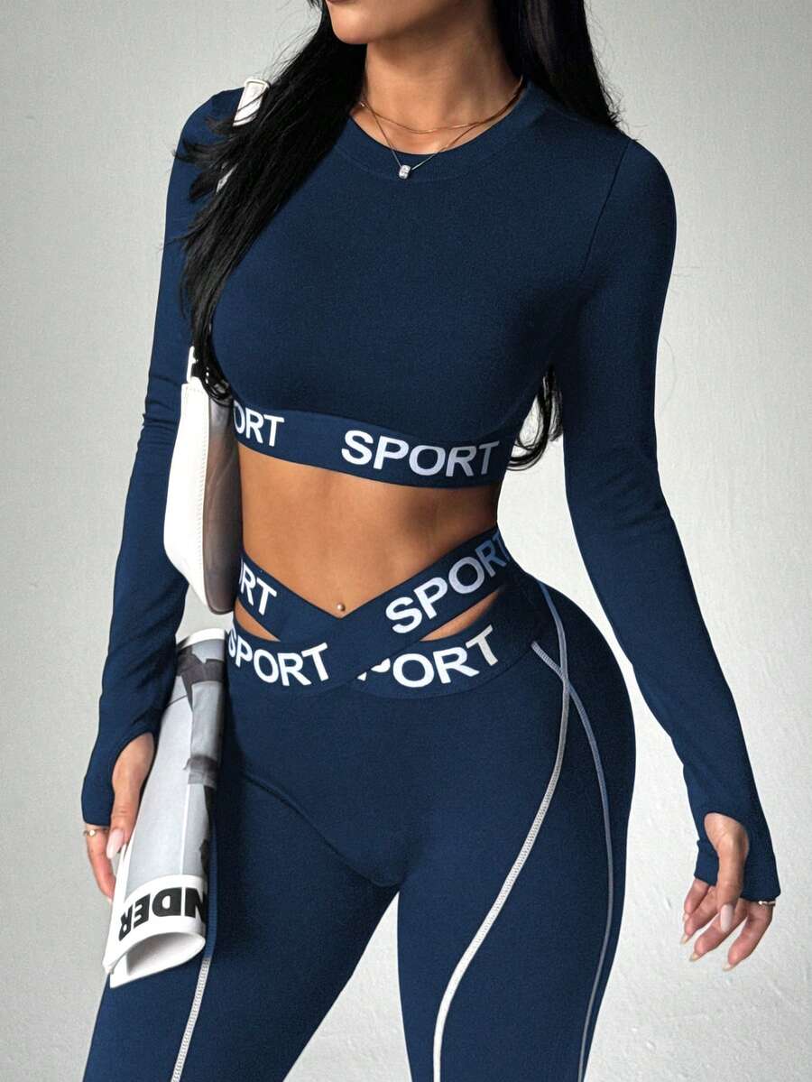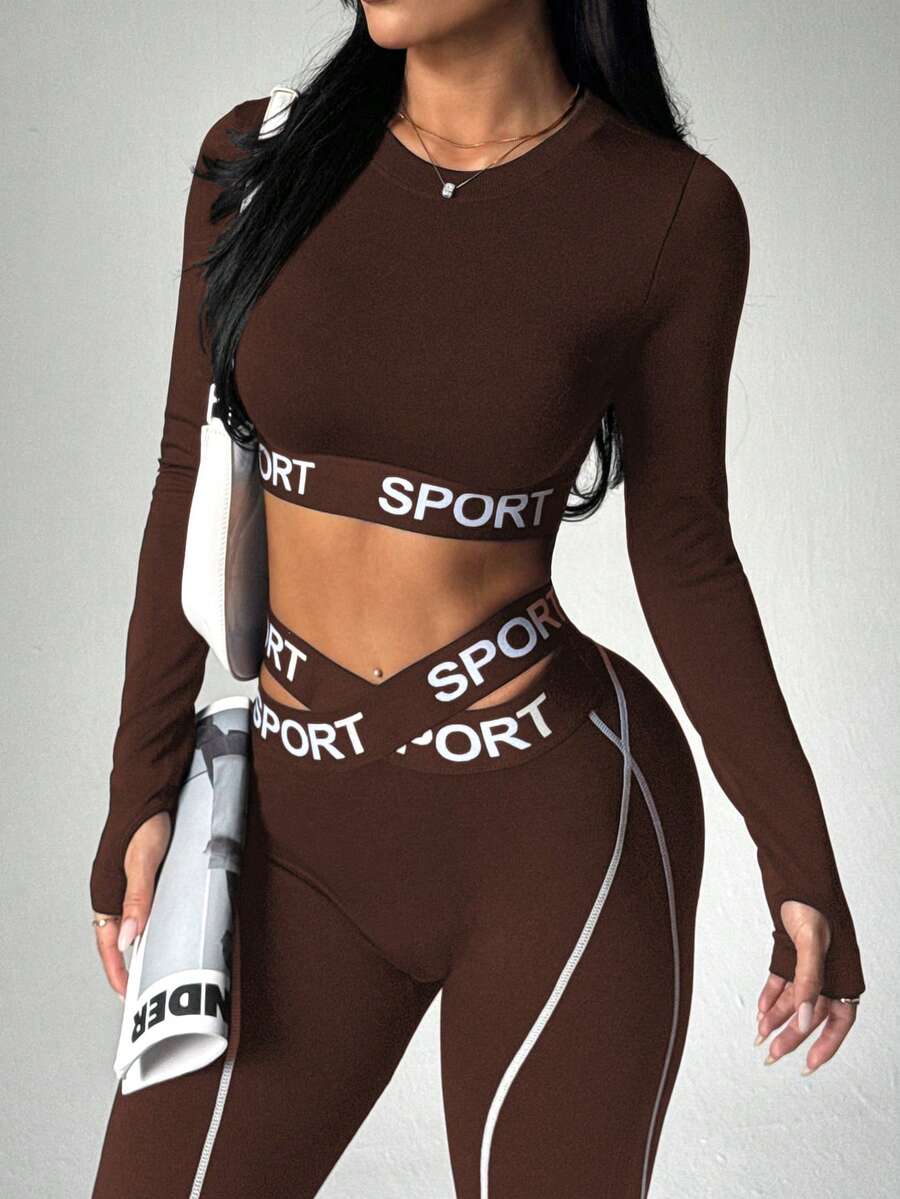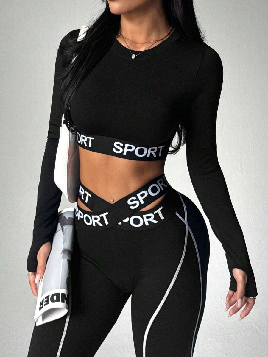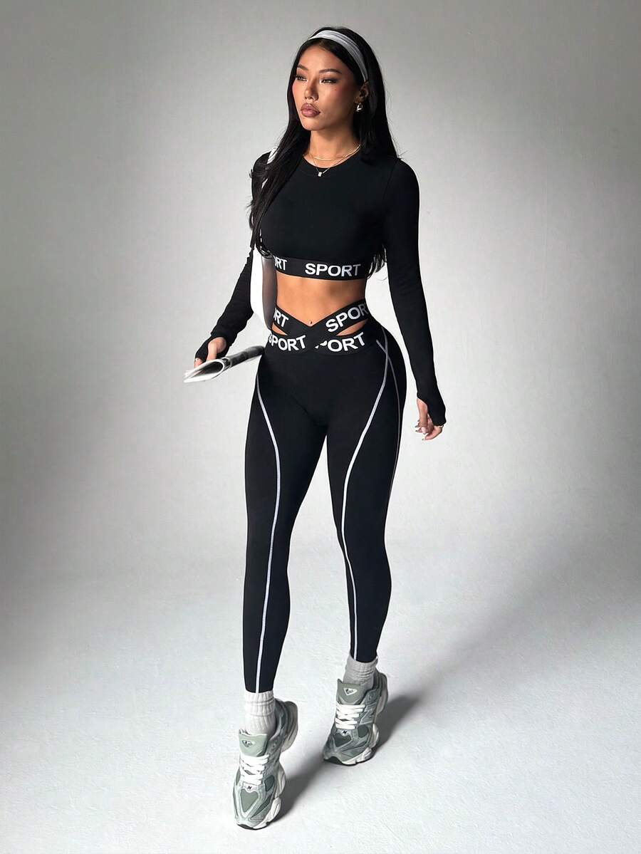 2 pezzi Set sportivo da donna con top a maniche lunghe e leggings, con vita elastica, stampa a strisce a contrasto e lettera