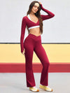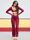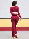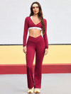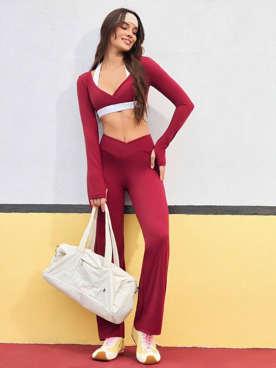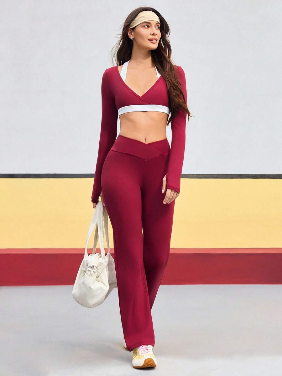 Completo da donna composto da top corto a collo alto senza maniche e pantaloni a zampa, in colori a contrasto.