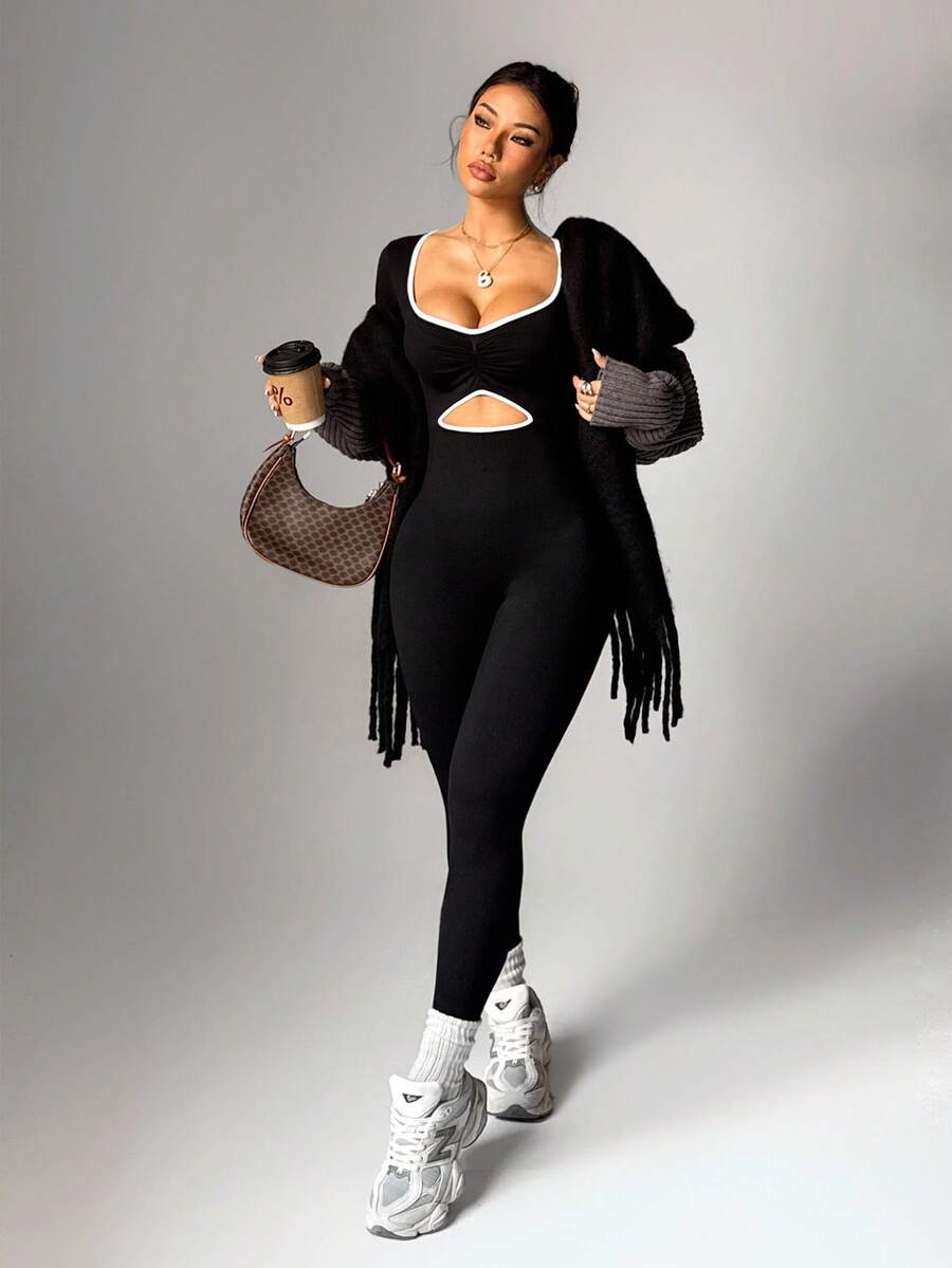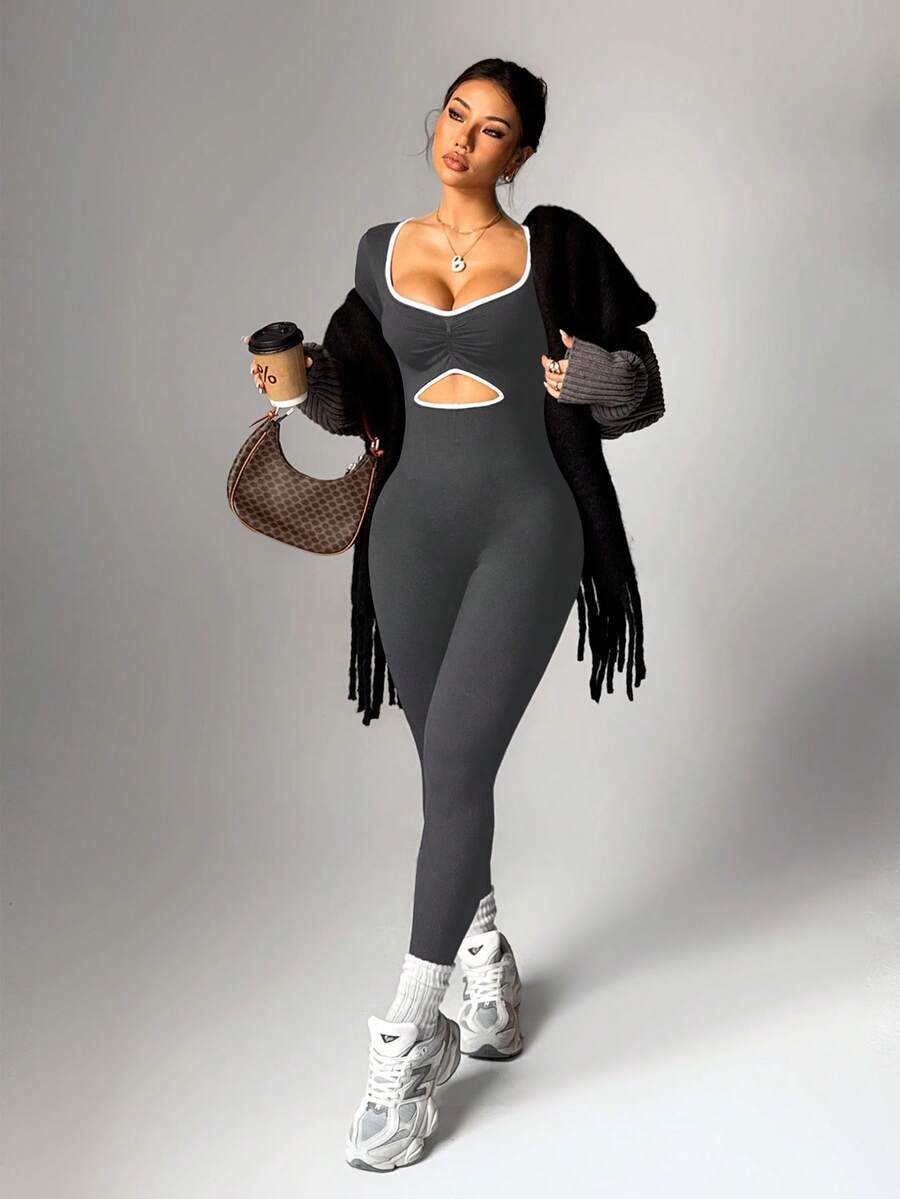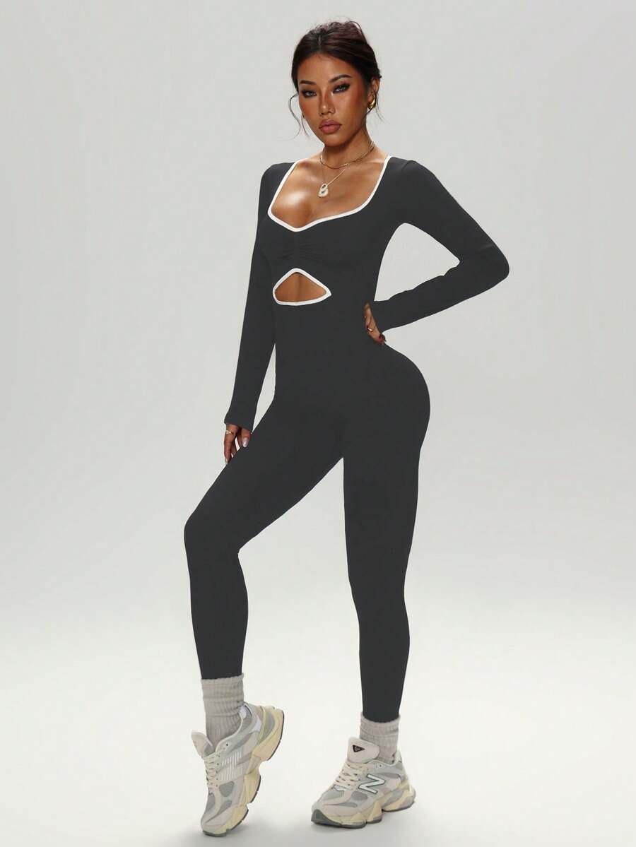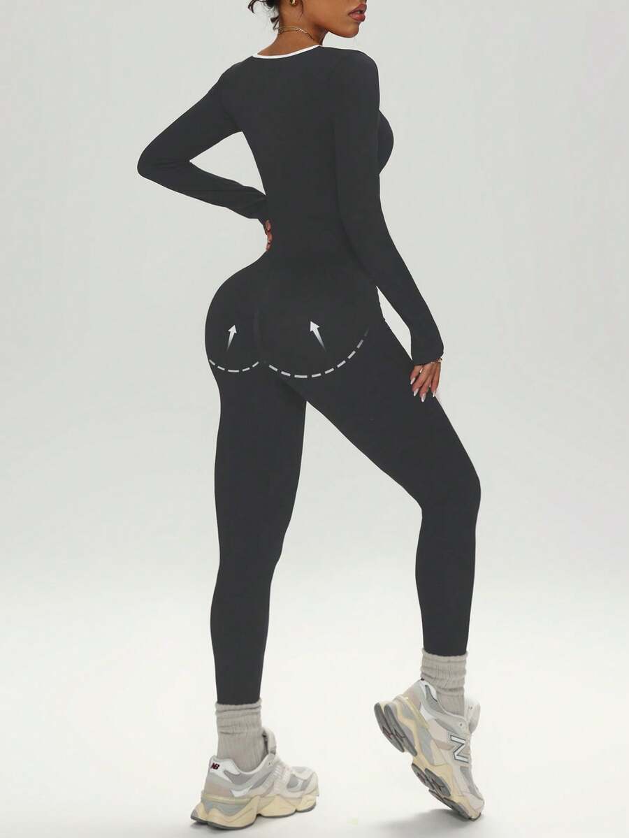 Tuta da donna sportiva e sexy con design a contrasto di colore, che valorizza la figura, adatta per fitness e yoga